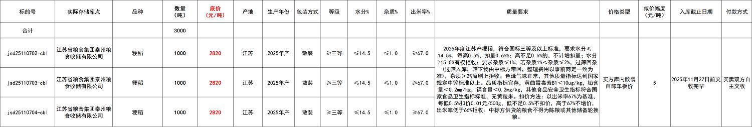 交易方式:本次競價交易使用國家糧食交易平臺新版地儲交易系統(tǒng),通過網(wǎng)絡對委托標的依次按交易節(jié)進行交易。請會員通過國家糧食交易中心官網(wǎng),登錄“國家糧食交易平臺”→“交易”→“江蘇”→“江蘇省儲備糧管理集團有限公司采購交易專場”參與交易。